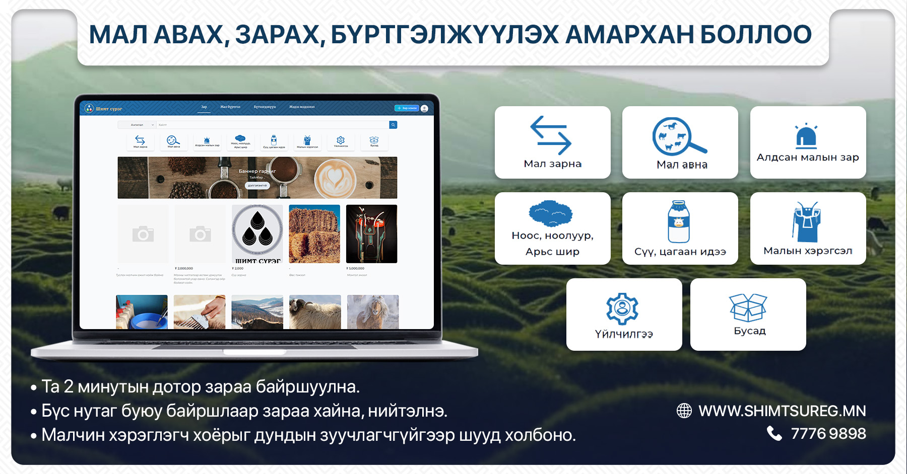 “Шимт сүрэг” төслийн хүрээнд Мал аж ахуйн салбарын цахим захыг та бүхэндээ хүргэж байна. Энэхүү цахим захын давуу тал нь хот суурин газрын иргэд ч мал арилжаанд оролцох, тухайлсан орон нутгаасаа мал, сүү, цагаан идээ, ноос ноолуур, арьс ширийг анхны эх үүсвэрээс нь худалдан авах боломжтой болгох зэрэг хялбар шийдлүүдийг бий болгожээ.