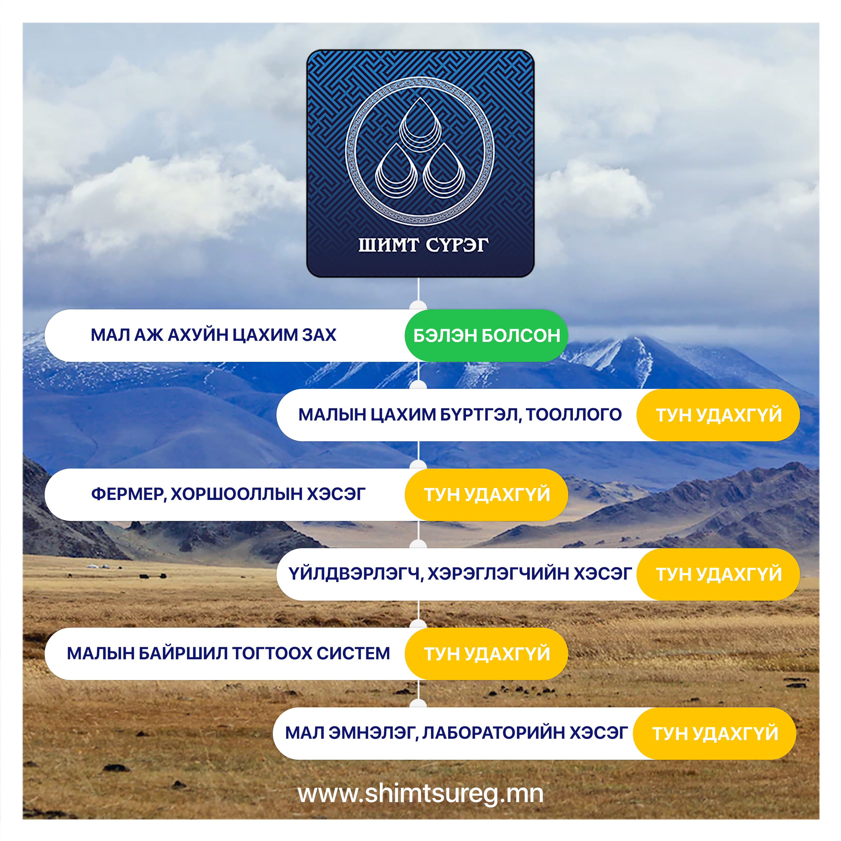Одоогоор эхний үйлчилгээ болох www.shimtsureg.mn мал арилжааны цахим захыг олон нийтэд хүргэж байгаа бол дараагийн ээлжид Малын цахим бүртгэл, тооллогын модулийг хэрэглээнд удахгүй нэвтрүүлнэ. Ингэснээр малчид гар утаснаасаа малаа бүртгэх, мал сүргийнхээ ашиг шим, эрүүл мэнд, шилжилт хөдөлгөөний мэдээллээ хөтлөх зэрэг олон боломжийг хэрэглэгчдэдээ нээх юм.